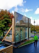 Utanför arbetsbodarna på Medicinareberget, i närheten av Zoologen, visas ett prov på Natriums kommande fasad. Styrgruppen för Natrium stannade till före sitt möte för att ta en närmare titt på hur husets utsida kommer att se ut. Projektledare Mats Lilja berättade för styrgruppen om design och utformning av den bronsfärgade fasaden.